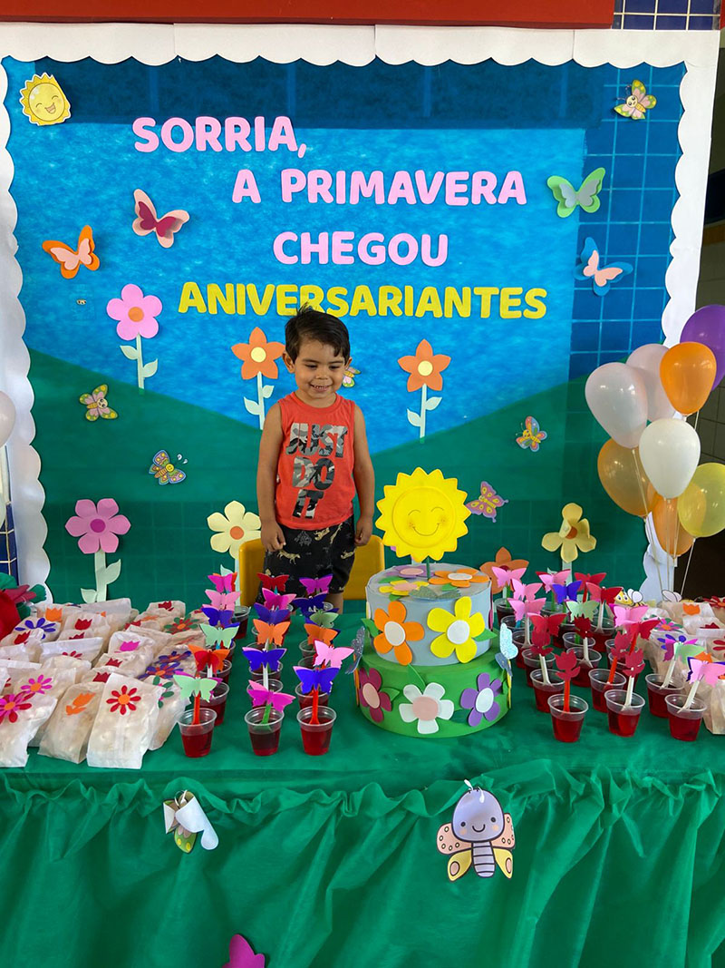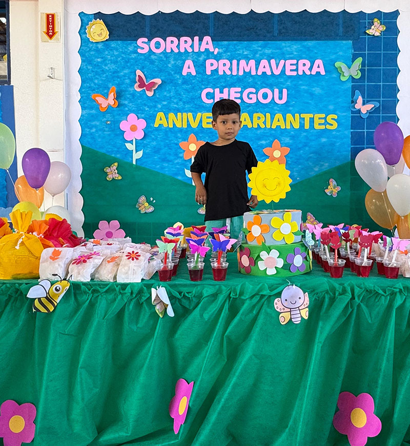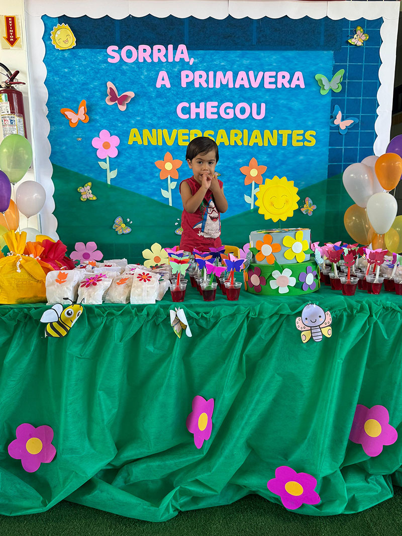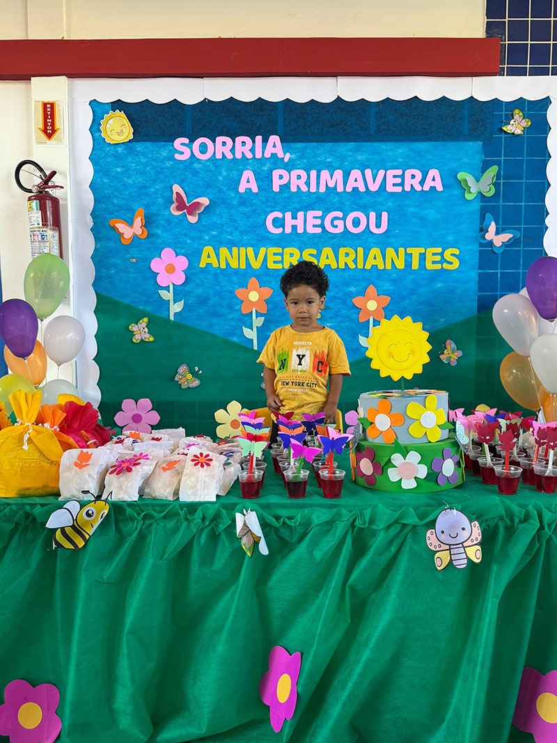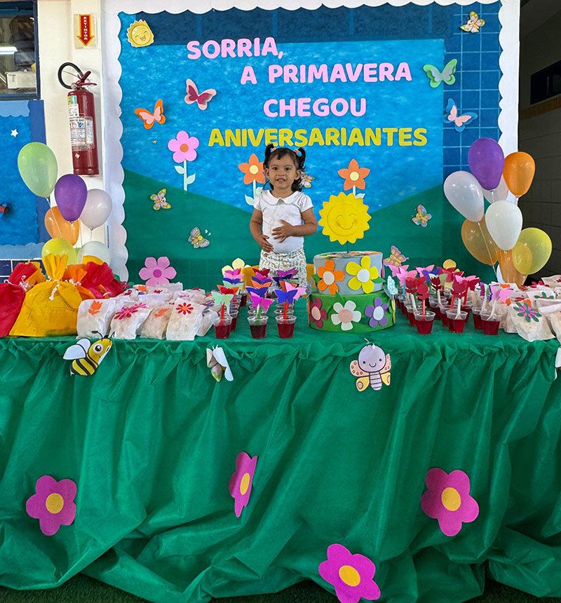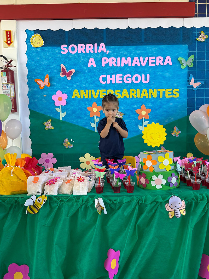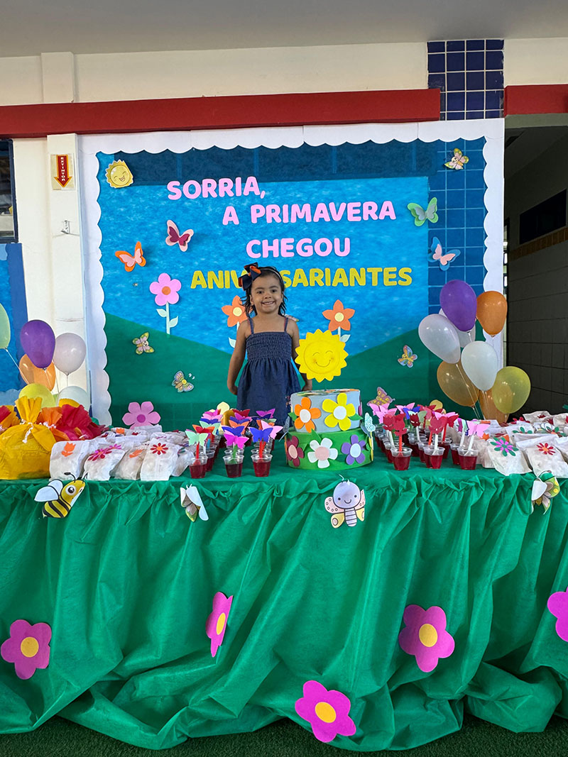 A decoração temática trouxe o colorido da nova estação para dentro da escola, com flores, borboletas e elementos que simbolizam o renascimento, a alegria e a união. Os aniversariantes foram o destaque da festa, recebendo homenagens carinhosas e desfrutando de um ambiente pensado especialmente para eles.