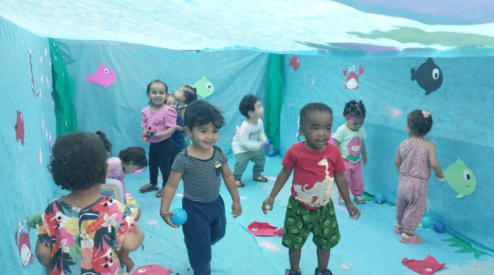 Durante a atividade, o ambiente foi decorado com elementos que remeteram ao oceano, como peixes coloridos, corais, algas e outros seres marinhos. As crianças participaram de brincadeiras, ouviram histórias e aprenderam sobre a importância da preservação dos oceanos e dos animais que vivem nele.