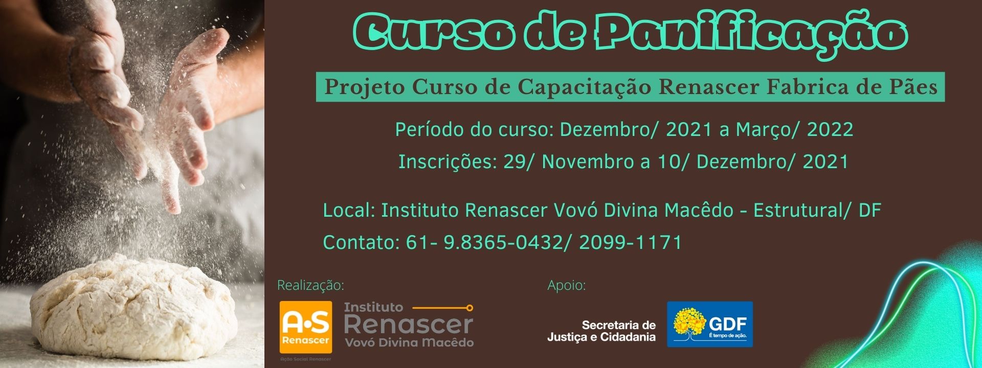 A Ação Social Renascer abre as inscrições para o Projeto Curso de Capacitação Renascer- Fábrica de Pães, com apoio da Secretaria de Justiça e Cidadania – SEJUS